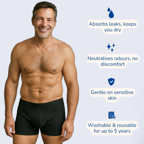 EliteVienna's ultra-absorbent boxer briefs feature 4 powerful protective layers designed to stop all types of bladder leaks — stress, urge, or overflow.